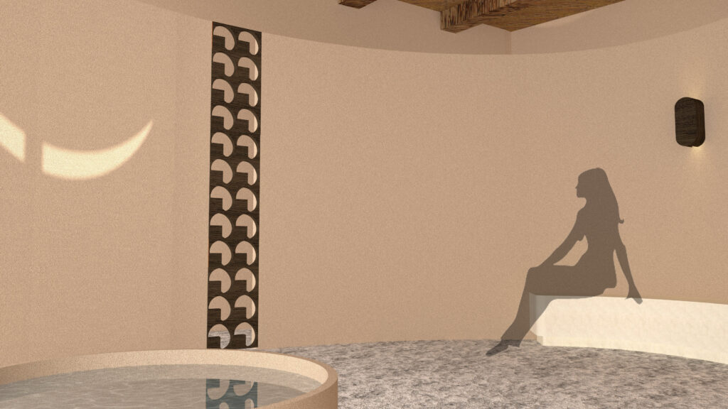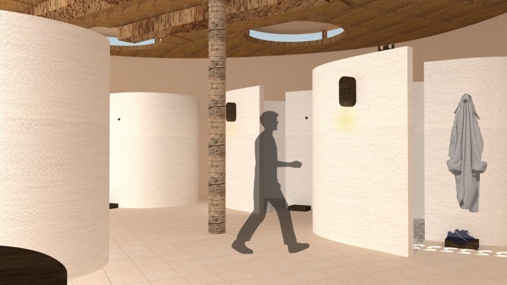 La thérapie s’exprime à travers chaque pas posé sur le sel et à travers l’exploration d’une grotte saline pensée comme un espace de ressourcement intime. L’expérience offre une dimension sensorielle différente selon la saison. L’architecture s’appuie sur des matériaux locaux, traditionnels : terre crue, pierre du Sahara, bois de palmier…