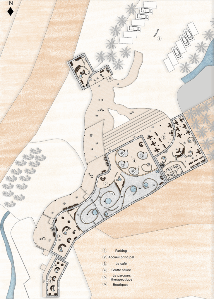 Tamaghza, l’Oasis des Sens, est un centre thérapeutique dédié au sel, ancré dans les dynamiques naturelles du désert tunisien. Inspiré par l’érosion, la roche et la force de l’eau, le projet propose une expérience immersive où chaque espace évoque les strates naturelles du paysage.
